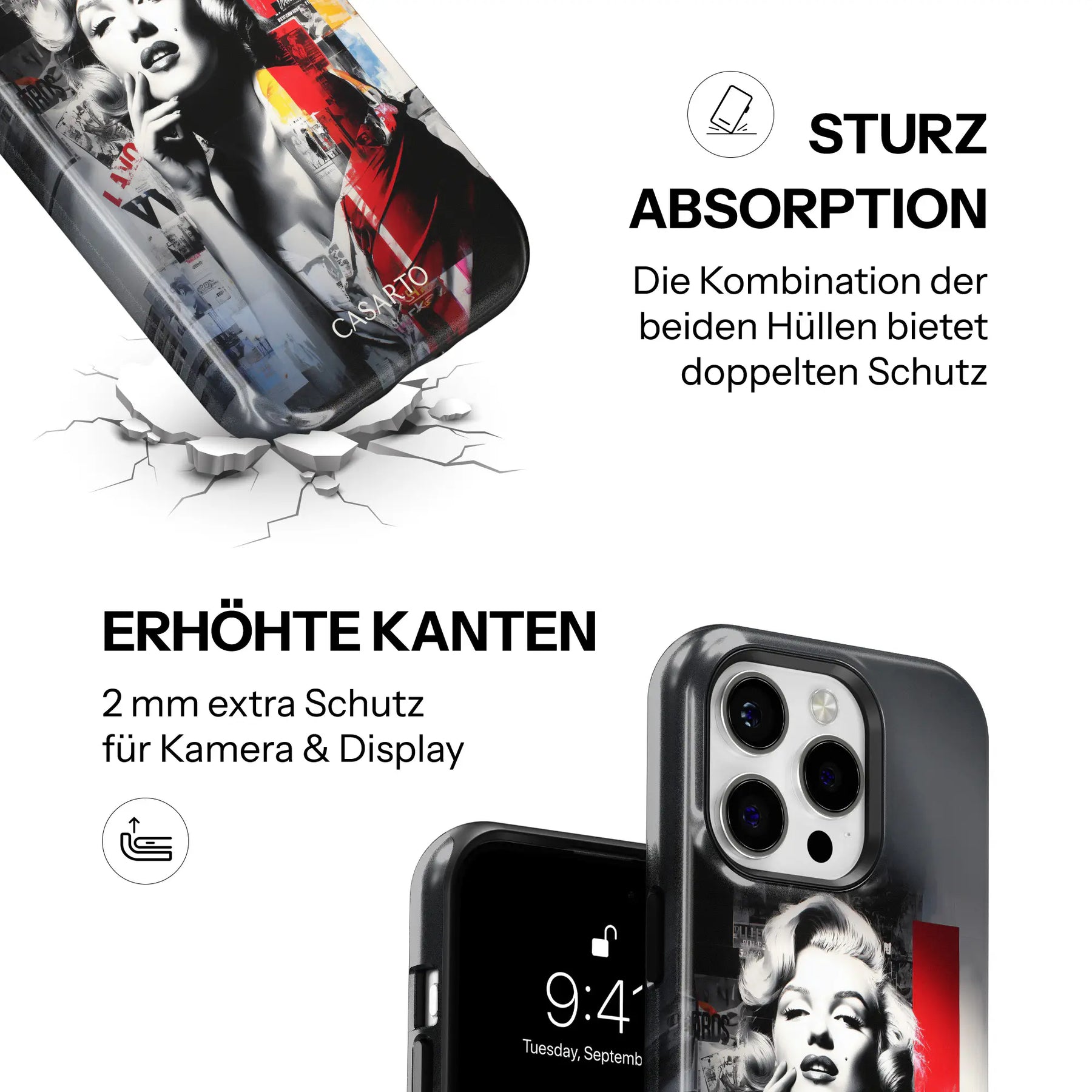 Our Casarto Cases impress not only with bold designs but also with durability and function. The combination of shock-absorbing silicone and a sturdy hard shell reliably protects your smartphone – day after day. The high-quality print remains brilliant, even with intensive use.