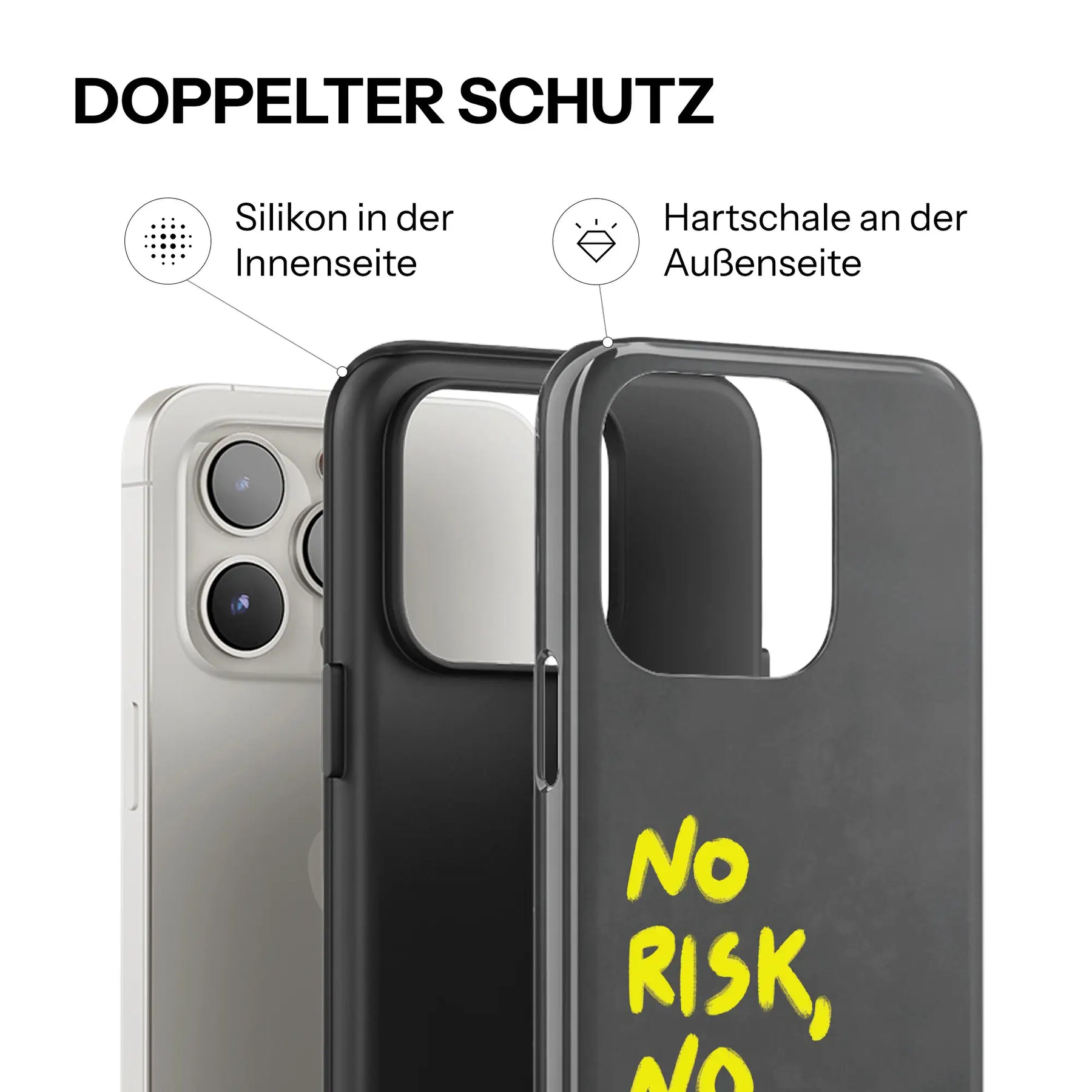 Jedes Case kombiniert eine präzise gefertigte Silikonform im Inneren mit einer glänzenden Hartschale außen. Das Ergebnis: Ein Case, das sich perfekt an dein Smartphone anschmiegt, es zuverlässig schützt und dabei mit einem stilvollen Design überzeugt.