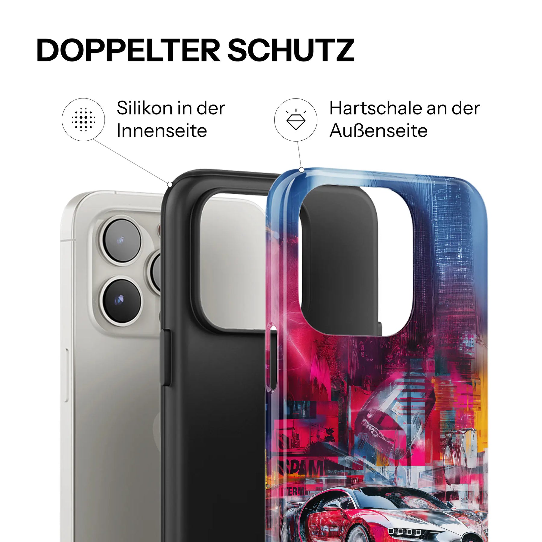 Jedes Case kombiniert eine präzise gefertigte Silikonform im Inneren mit einer glänzenden Hartschale außen. Das Ergebnis: Ein Case, das sich perfekt an dein Smartphone anschmiegt, es zuverlässig schützt und dabei mit einem stilvollen Design überzeugt.