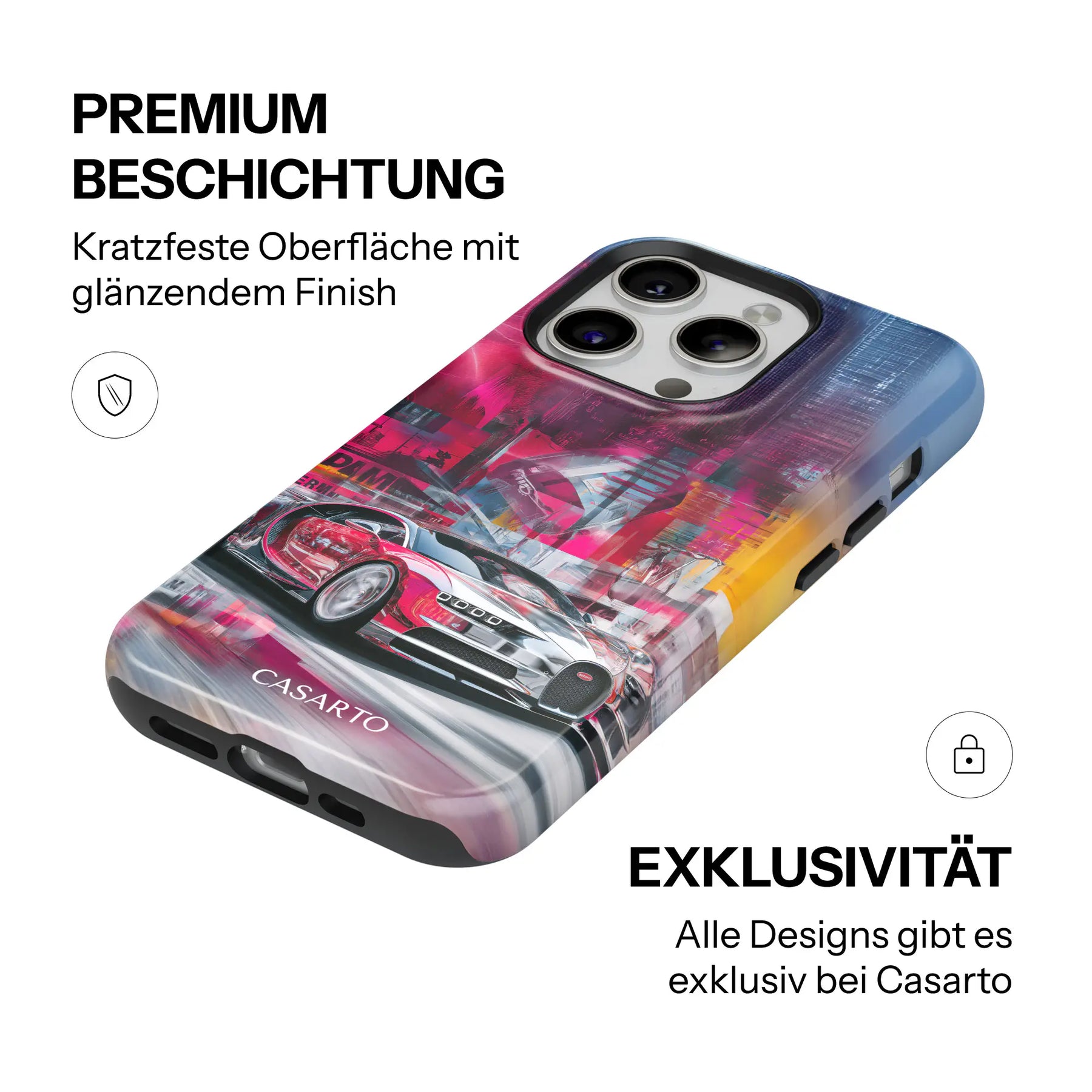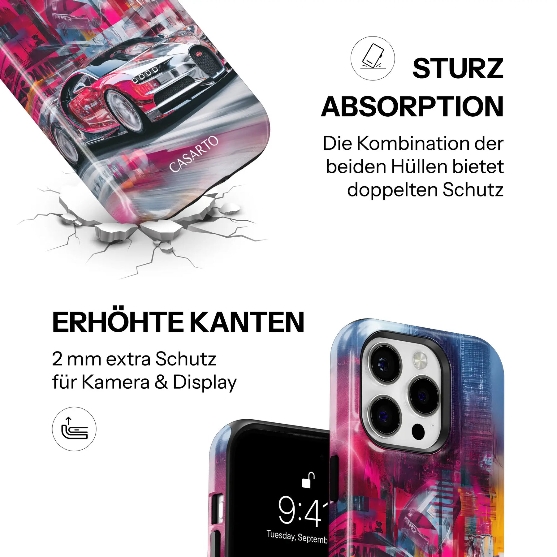 Nuestras Casarto Cases convencen no solo por sus diseños llamativos, sino también por su durabilidad y funcionalidad. La combinación de silicona amortiguadora de impactos y una carcasa dura y resistente protege tu smartphone de forma fiable – día tras día. La impresión de alta calidad permanece brillante, incluso con un uso intensivo.