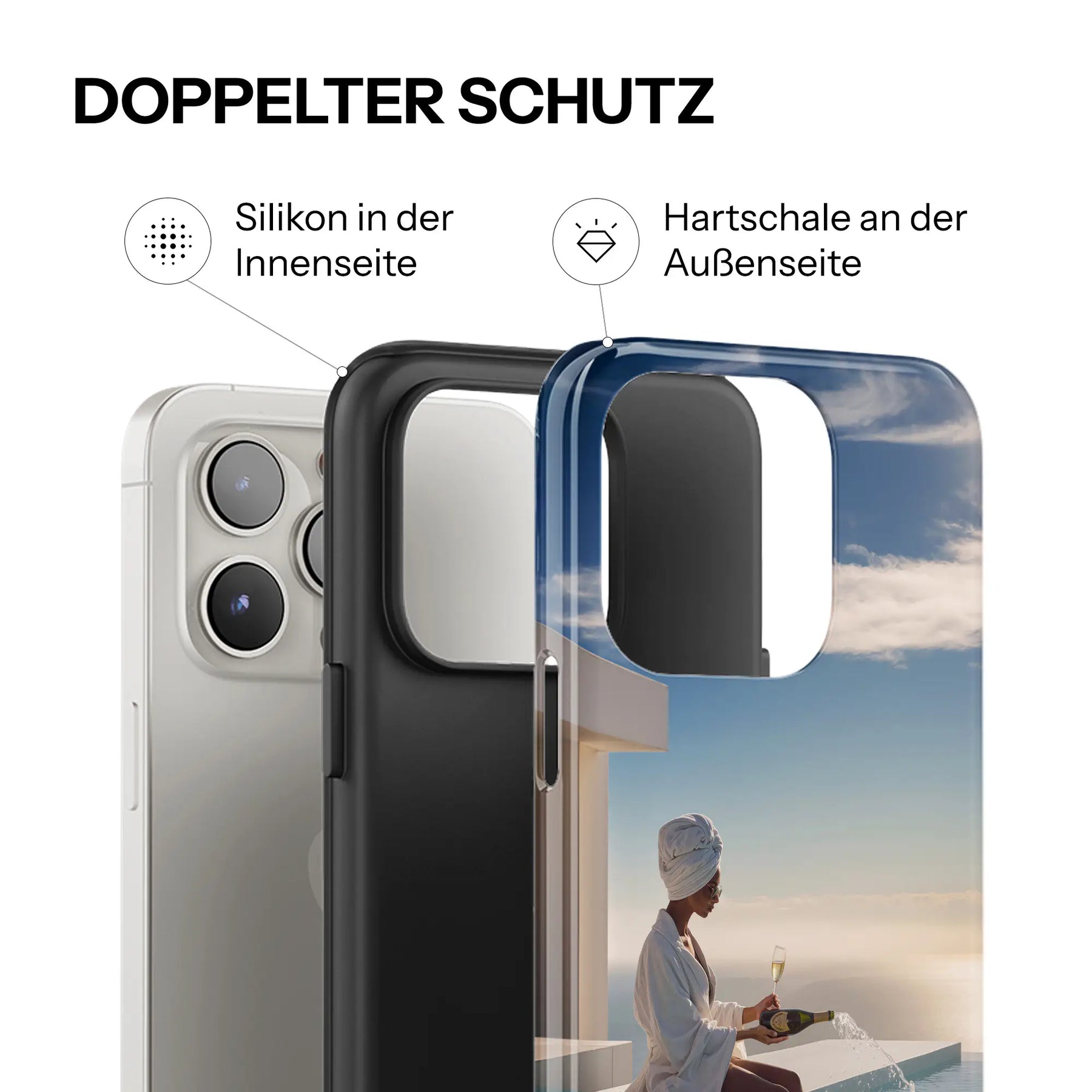 Jedes Case kombiniert eine präzise gefertigte Silikonform im Inneren mit einer glänzenden Hartschale außen. Das Ergebnis: Ein Case, das sich perfekt an dein Smartphone anschmiegt, es zuverlässig schützt und dabei mit einem stilvollen Design überzeugt.