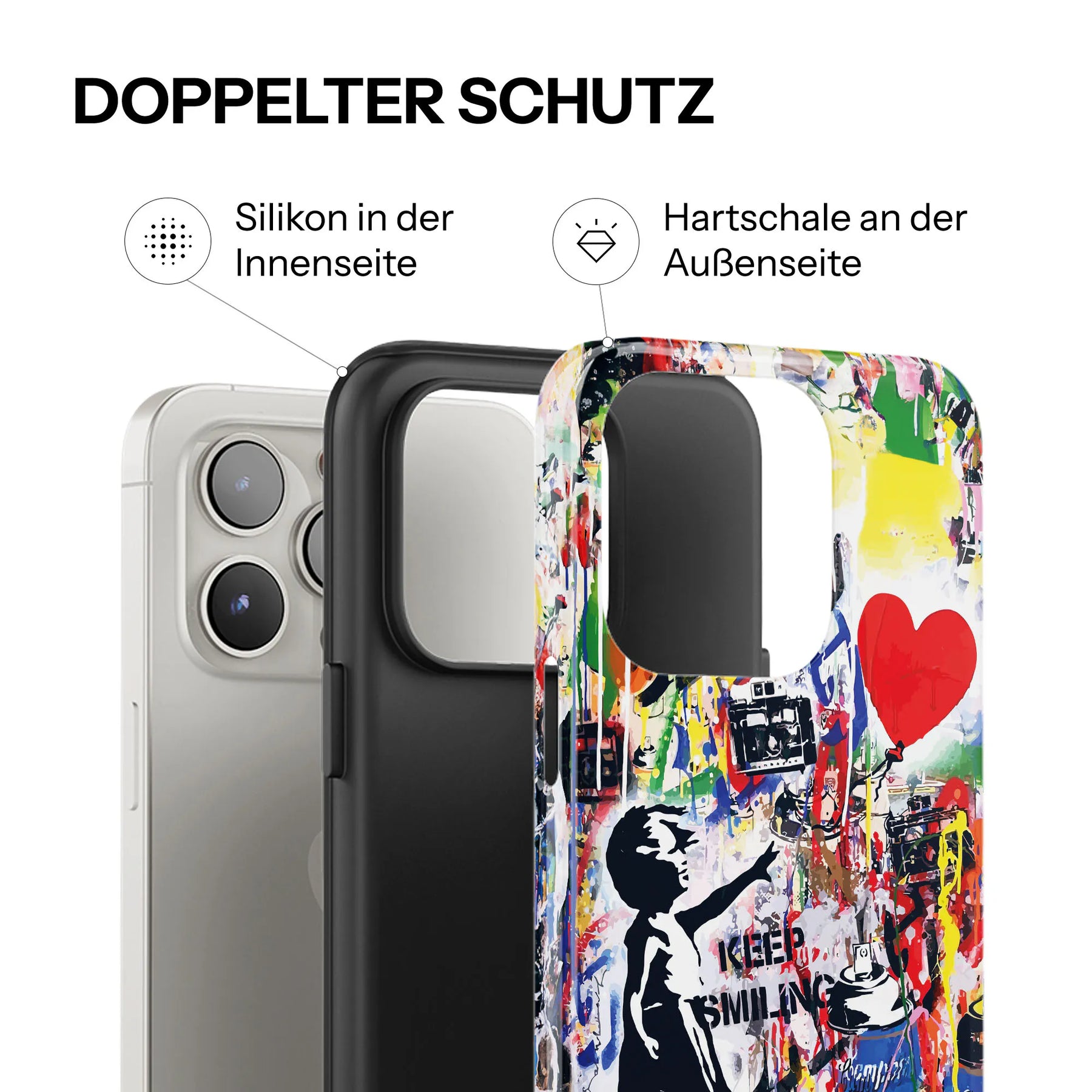 Très bien. Nos coques sont composées de deux couches: un insert soft-touch amortissant les chocs + une coque extérieure rigide. Cela protège ton smartphone de manière fiable contre les rayures, les chutes et toutes les folies du quotidien – sans paraître encombrant.